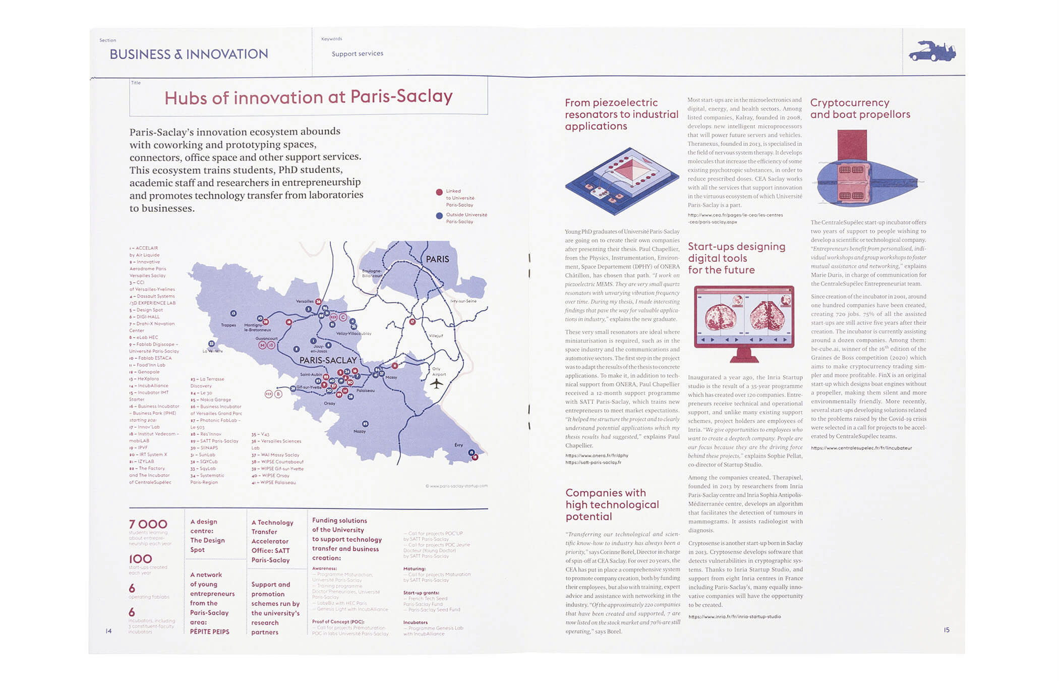 Information review for the campus. Paris Saclay’s campus gather Parisian scientific schools, laboratories, innovation clusters and industrials. 22,5 x 32 cm – 28 pages Illustration: Simon Bailly