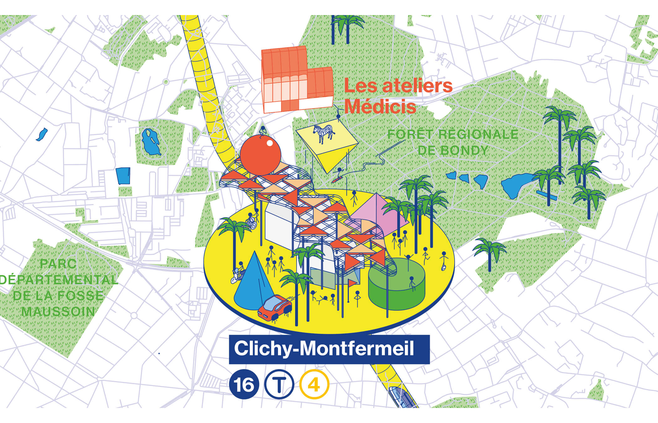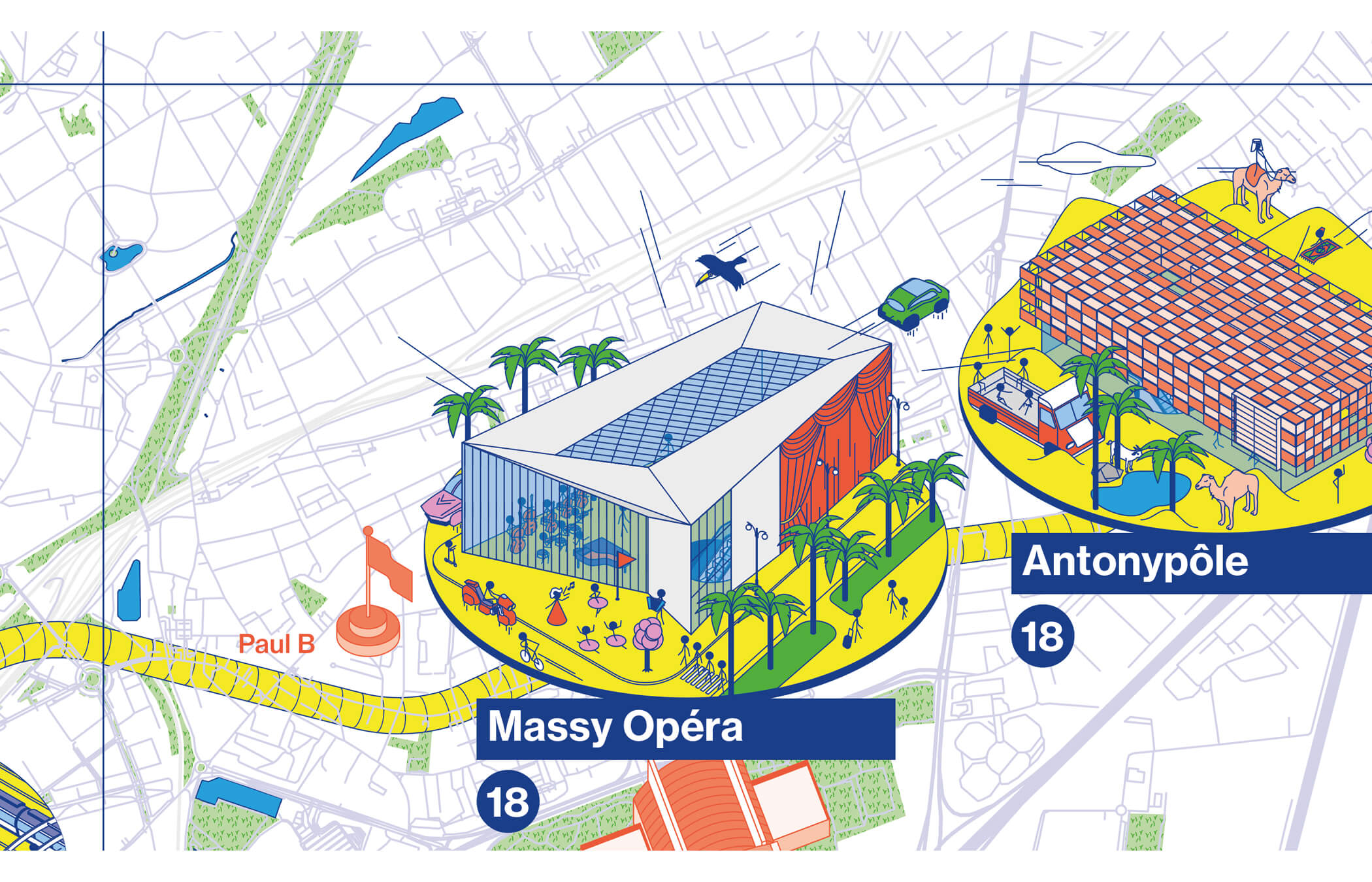 Illustrated map for the subway network Grand Paris Express. Interpretation of 68 architectural projects for train stations. 700 × 1 100 cm Station architect : Grimshaw Architects